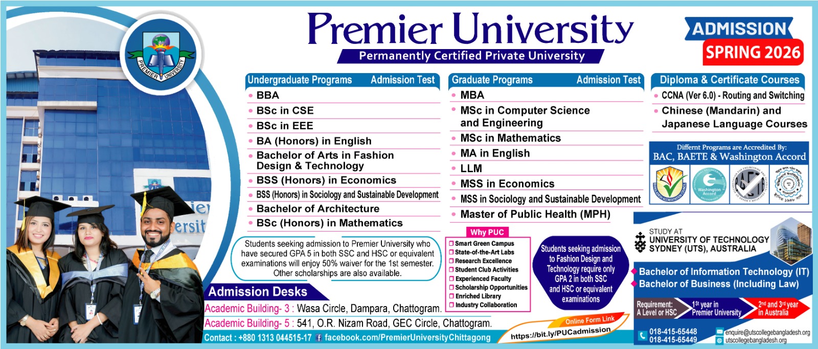 For further details, international students may contact the university’s admission office over the phone or through email.Phone: Admission Office: +8801313044515-17Email: foreign_admission@puc.ac.bd.