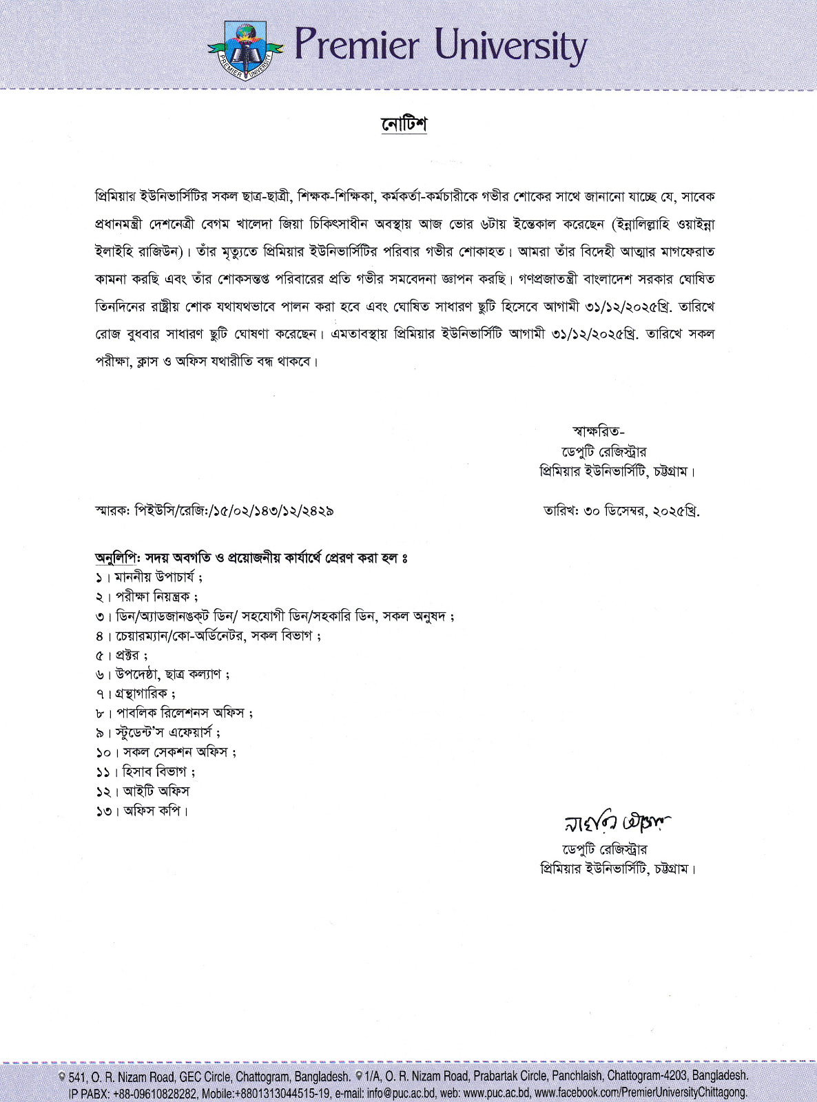 সাবেক প্রধানমন্ত্রী বেগম খালেদা জিয়ার মৃত্যুতে সাধারণ ছুটি ঘোষণা